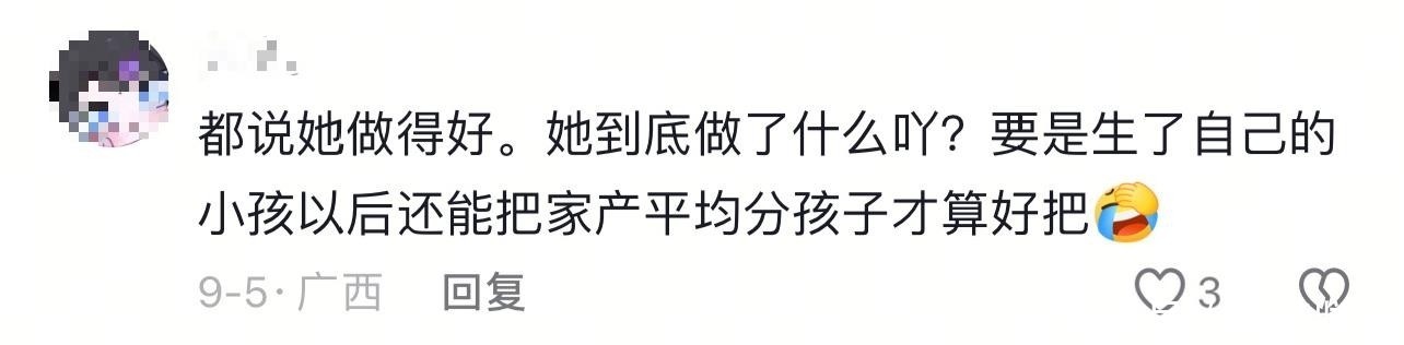 有人质疑马筱梅有何资格谈论S家事务,声称对方根本不会接纳她;也有人提出,倘若她将来生育亲生子女后仍愿公平分配家产,才算真正无私。